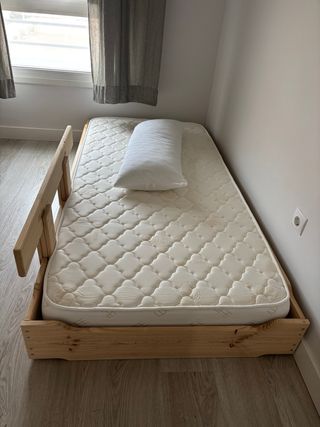 Cama de estilo Montessori de madera natural, ideal para fomentar la autonomía. - Medidas: 90x190 cm. - Incluye barra protectora lateral. (Se vende sin colchón)