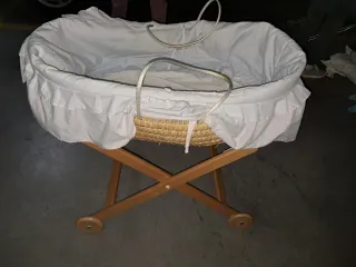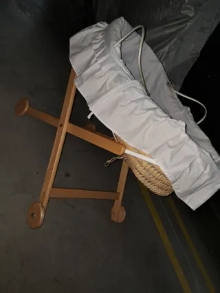 Cuna tipo cesta con un diseño clásico y funcional, ideal para los primeros meses del bebé. Cuenta con un soporte de madera que incluye ruedas para facilitar su movilidad. - Cesta de mimbre. - Forro interior blanco con volantes. - Asas de transporte. - Soporte de madera con ruedas. Si no se vende en unos días irá a la basura, por necesidad de espacio.