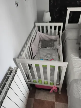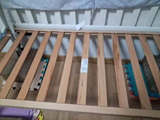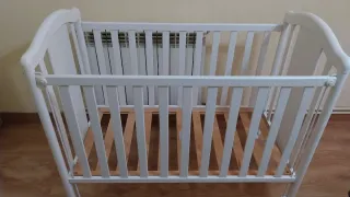 Cuna de madera blanca, ideal para habitaciones infantiles, con somier. Se encuentra desmontada y me urge por que necesito espacio. SIN COLCHON. Mi pequeño ya ha crecido y la hemos cambiado hace poco. - Estructura de madera. - Barreras de seguridad.