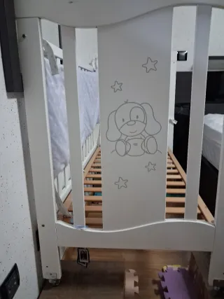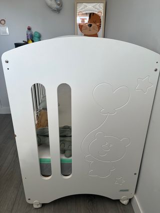 Cuna de bebé en color blanco, con un diseño infantil. Colchón incluido. Tiene el lateral también para poder cerrar la cuna completamente - Estructura de madera. - Barreras de seguridad.