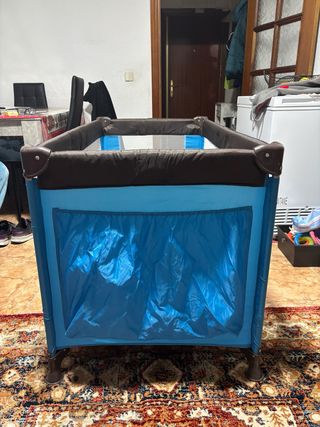 Cuna de viaje portátil con laterales de malla. - Color azul marino. - Estructura de plástico gris. - Ruedas para facilitar el transporte. - tiene una hamaca para mayor descansa del bebe Esta en muy buen estado, y casi sin uso, solo tiene una mancha de rotulador.