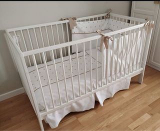 Cuna de bebé de madera de IKEA, en buen estado. Incluye colchón. - Estructura de madera clara. - Barreras de seguridad. - Colchón incluido. Se regalan varios accesorios, como el que se ve en la imagen para meter los pañales y cremas ( de ikea también), alguna sábana casi nueva, y alguna cositas más de bebé en perfecto estado.