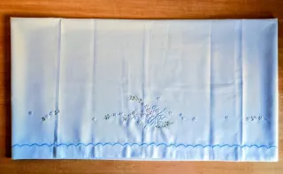 Conjunto de ropa de cama para cuna con un delicado bordado floral y borde festoneado azul. - Incluye sábana de arriba y funda de almohada. - Medidas: .- Sabana: 126 x 81 CMS. .- Funda: 51,5 x 27,5 CMS. - Material: Algodón. - Color: Blanco. - NO presenta roturas ni manchas. - Diseño con flores bordadas (a mano) en varios colores, tanto en la sábana como en la funda de almohada. - Puntilla festoneada (a mano) tanto en el borde superior o embozo de la sábana como en los extremos de la funda de almohada.