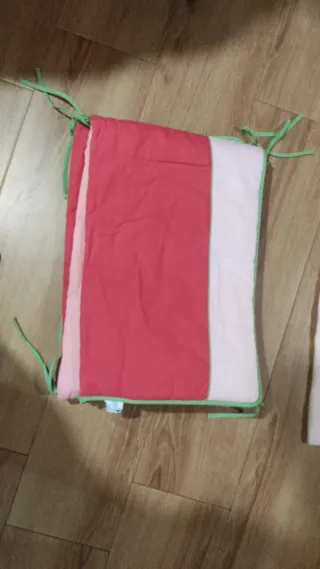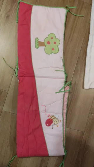 Protector de cuna en tonos rosas, con un diseño infantil. - Dibujo de árbol y abeja. - Ribete y lazos en color verde.