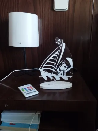 Lámpara decorativa con diseño de barco pirata, ideal para mesita de noche. - Figura de barco pirata con un tripulante. - Base blanca. - Incluye mando a distancia para cambiar colores y cable con usb