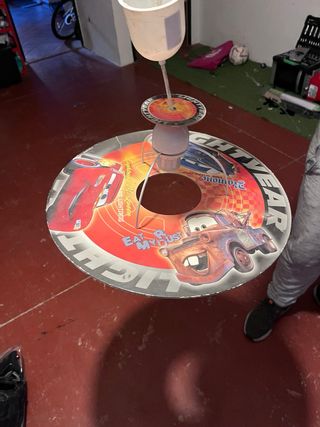 Lámpara decorativa con personajes de Cars. Ideal para habitaciones infantiles. - Diseño circular con Rayo McQueen y Mate. - Incluye texto Lightyear y Eat my dust. - Personajes de Disney Pixar.
