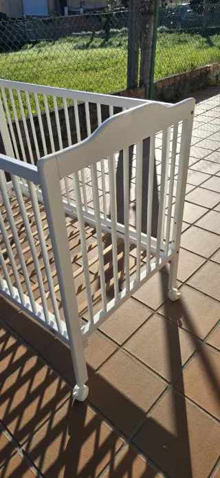 Se vende cuna blanca junto con su colchón. - Estructura de madera. - Colchón incluido. Tiene alguna marca del uso tal y como se aprecia en las fotos. Le falta tambien un tornilo (también está en las fotos). Regalo protector de colchón (tiene bolitas) y conjunto de sábanas (en perfecto estado: bajera de rayas, funda de nórdico reversible y funda de almohada)