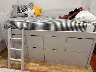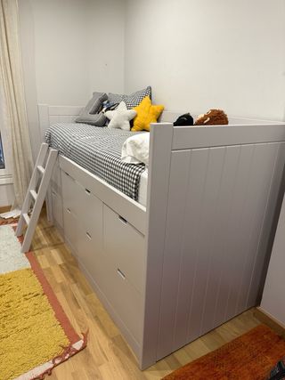 OFERTA: CAMA+ESTANTERÍA+MESA+SILLA=1999€ Cama elevada para niños o jóvenes con espacio de almacenamiento integrado. - Incluye friso alrededor - Escalera de acceso. - 8 cajones amplios para guardar objetos, medidas 80 cm de largo por 40 cm de ancho por 24 cm de alto Incluye somier de lamas de madera y colchón de 90 cm de ancho por 190 cm de largo. Medida de la cama 200 cm de largo por 100 cm de ancho por 122 cm de alto. Color gris claro. Minimalista y muy práctica por su amplio almacenaje. Web fabricante muba.design producto: cama-xl-block-con-friso PVP 3142 €