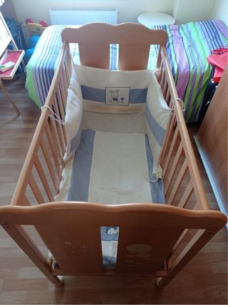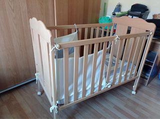 Cuna de bebe en perfecto estado de madera con barra lateral y regulable en altura. Con colchon en perfecto estado y de gama premium anti bacterias y anti acaros fabricado en 2022. Casi no ha tenido uso, para casa de los abuelos, se ha usado el colchon muy pocas veces.