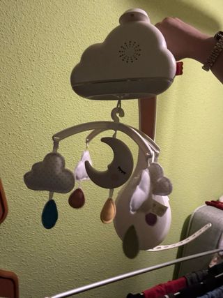 Móvil musical para cuna con figuras de nubes, luna y gotas de lluvia. - Diseño infantil y colorido. - Incluye figuras de tela. - Base de plástico blanco.