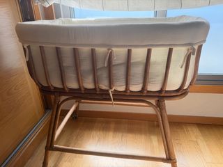 Moisés de ratán de Zara Home con un diseño natural y acogedor. - Estructura de ratán. - Incluye colchón y funda de algodón. - Atado con cintas de tela. Las ruedas funcionan bastante mal, pero es de fábrica. Ya al recibirlo, el giro de las mismas se bloquea bastante.