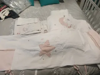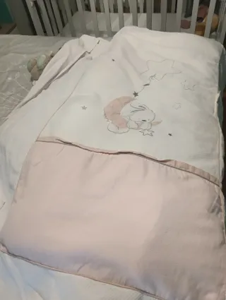Conjunto de ropa de cama para cuna con un tierno diseño de estrellas y conejito. Consta de: - Protector colchón. - Sabana Bajera,encimera - Funda nórdica + chichonera - Relleno. - Tejido suave y agradable al tacto. - Estampado de estrellas y un dulce conejito. - Tonos pastel y blancos.