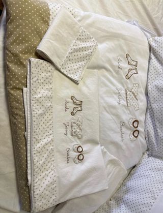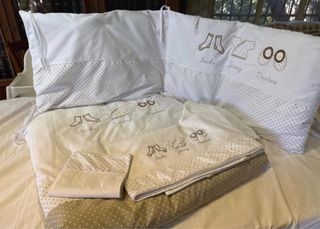 Conjunto de ropa de cuna que incluye sábanas,chichonera, funda nordica y relleno. - Diseño con estampado de topos. - Incluye chichonera. - Sábanas para cuna de 140 cm.