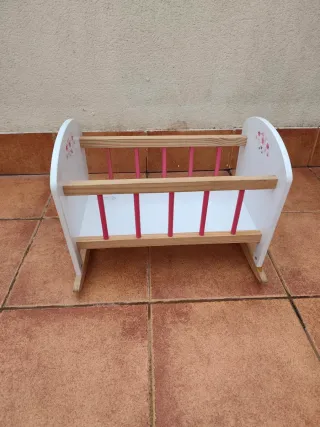 Cuna de madera para muñecas, con un diseño encantador. - Estructura principal en color blanco. - Detalles decorativos de flores en rosa. - Barandillas de madera y barrotes en color rosa.