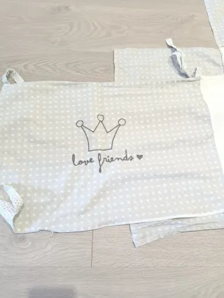 Protector de cuna con un diseño tierno y divertido. Lo entrego con los cojine, en la foto no aparecen. - Estampado de estrellas y lunas. - Dibujo de un osito. - Frase love friends con una corona.