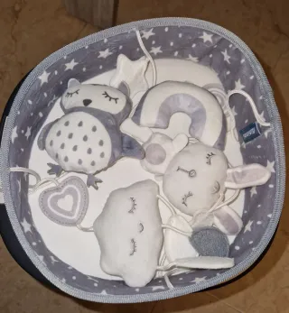 Móvil decorativo para cuna con un diseño de estrellas y animales. - Estructura circular con tela gris y estrellas blancas. - Incluye figuras colgantes de animales y estrellas.