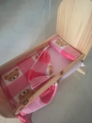 Cuna artesanal para muñecas, perfecta para horas de juego. - Fabricada en madera natural - Ropa de cama, sabana y colcha hechos a mano. - Diseño único y hecho a mano.