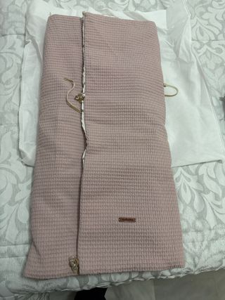 Saco para capazo en color rosa, con un diseño acolchado y detalles de volantes. - Acolchado suave. - Ribete de volantes en la parte superior. - Cierre con botones.