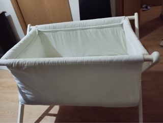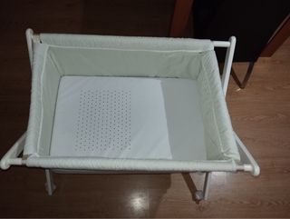 Cuna de bebé con un diseño moderno y práctico. La estructura es resistente y es fácil de mover por la casa, porque tiene ruedas. Está como nueva. No la hemos usado porque utilizamos una cuna de colecho. Medidas en la última foto. Se debe recoger en Rubí.