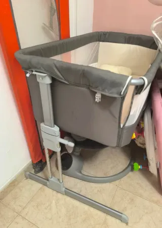 Cuna colecho Chicco Next2me Essential, ideal para tener al bebé cerca durante la noche. Diseñada para facilitar la lactancia y el descanso compartido. - Tejido del moisés hecho de poliéster reciclado. - Apta desde 0 meses hasta 9 kg. - Incluye 1 unidad. Tiene un único defecto. Una de las patas que se doblan se safó