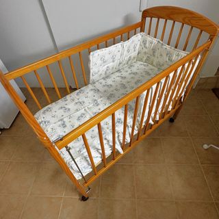 Cuna de madera de pino, ideal para el descanso del bebé. Su diseño clásico se adapta a cualquier habitación. - Estructura de madera de pino. - Ruedas para facilitar su movilidad. Con la cuna, regalo colchón, y varias piezas de ropa de cama. (Los protectores que se muestran en las fotos más varias sabanas de cuna. Está algo usada, pero conserva el buen aspecto, y está en perfectas condiciones de uso.