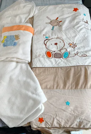 Conjunto de ropa de cuna con un tierno diseño de osito y otros elementos infantiles. - Incluye funda nórdica y protector. - Estampado de osito, sol, pájaro y mariposa. - Detalles de estrellas bordadas. - Borde de tela a cuadros.