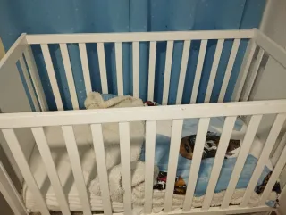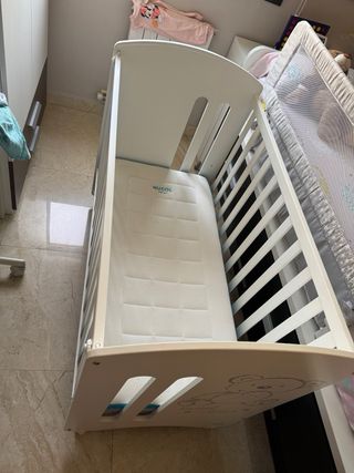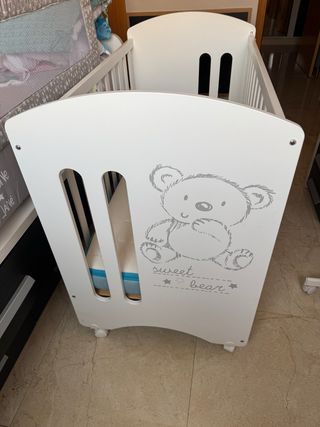 Cuna de bebé, casi nueva.Ha dormido 2 veces en ella. Posibilidad de colecho. Se vende completa: Colchón en estado perfecto, doble funccionalidad verano/invierno,para el bienestar del bebé. Protectores laterales Sabana bajerá impermeable 2 sábanas aparte+juego cama con sabana y funda nordica con estampado de animales marinos como los protectores