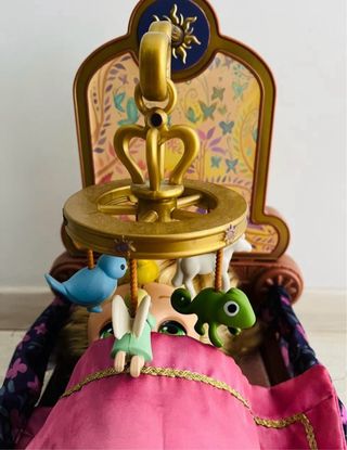Muñeca bebé Rapunzel con su cuna móvil. - La cuna tiene un móvil con figuras de animales y un hada. - La muñeca tiene detalles como pelo rubio y ojos verdes. - La cuna está decorada con motivos florales y mariposas.