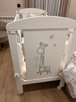Cuna de la marca Micuna en color blanco, con un encantador diseño de jirafa. - Diseño de jirafa en un lateral. - Ruedas para facilitar su movilidad.