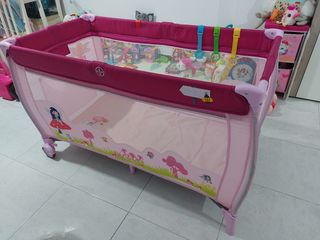 Parque cuna de color rosa con un diseño infantil. - Laterales de malla transpirable. - Estructura plegable para facilitar su almacenamiento. - Ruedas para moverlo fácilmente. - Incluye colgantes de juego.
