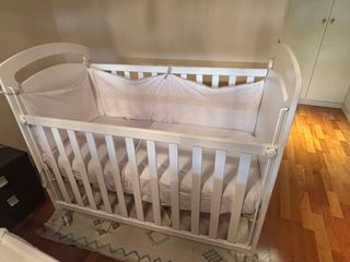 Cuna infantil de color blanco, incluyo colchón en muy buen estado y chichonera - Estructura de madera. - Barreras de seguridad. - Colchón incluido.