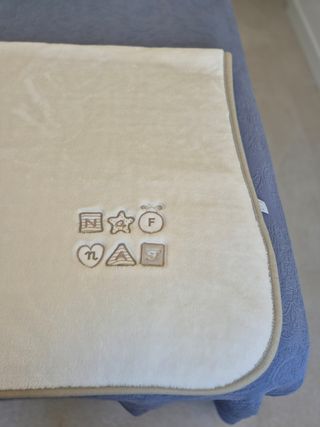 Manta de cuna de la marca Naf Naf en color beige. Es suave y acogedora. En excelente estado de conservación. - Diseño con pequeños iconos bordados.