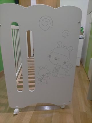 Cuna de bebé en color blanco, con un diseño infantil de ositos y espirales. - Estructura de madera. - Ruedas para facilitar el movimiento.