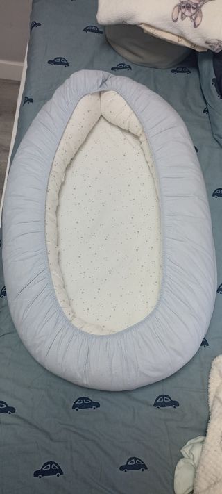 Reductor de cuna tipo nido para bebés. Suave y cómodo para el descanso de la marca cambrass. - Funda exterior en color azul claro. - Interior con estampado de estrellas grises. - Diseño ovalado.