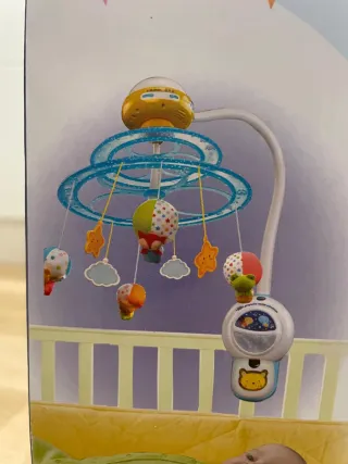 Móvil proyector Noche estrellitas de VTech Baby para cuna con luces y figuras de texturas suaves. Juguete que incluye una función de grabación de voz que permite grabar un mensaje de hasta 10 segundos. Ofrece tres modos de juego: nanas, naturaleza y descanso. El proyector cuenta con un mando a distancia con un botón luminoso y un programador de tiempo para seleccionar entre 10, 20 o 30 minutos de melodías. La base de la luz es desmontable y puede utilizarse como proyector independiente. Incluye un espejo de seguridad y un sensor de sonido que activa el juguete al detectar el llanto del bebé Precio original en tienda: 52€