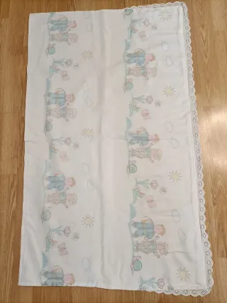 Sábana para cuna con un bonito estampado infantil. Ideal para el descanso de los más pequeños. - Medidas: 60 x 97 cm. - Diseño con nubes, soles, flores y personajes. - Borde con encaje decorativo.