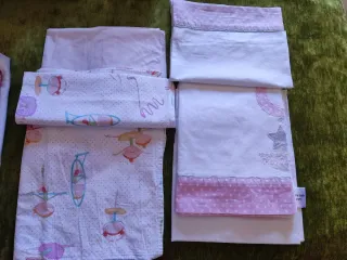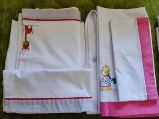 Sábanas cuna bebé. 4 juegos + 1 bajera blanca extra + almohada viscoelástica con funda de algodón desmontable. Muy buen estado.