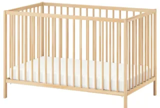 Cuna de bebé modelo Sniglar de Ikea, fabricada en madera clara. Entregamos con 2 colchones adicionales (colchón de cuna KRUMMELUR blanco + colchón de espuma estándar de Ikea) Todo en perfecto estado.