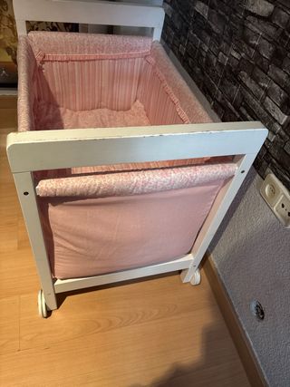 Cuna de bebé con un bonito diseño en color rosa, perfecta para las primeras etapas. - Estructura blanca. - Interior forrado en tela rosa con detalles. - Incluye colchón y cojín. - Ruedas para facilitar el movimiento.