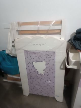 Mueble cambiador para bebé con bañera integrada y estructura de cuna. - Diseño con osito y estrellas. - Color blanco y morado.