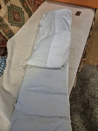 Protector de cuna con un diseño de rayas finas en blanco y azul claro. Es suave al tacto y proporciona un acolchado seguro. - Tejido de algodón. - Cintas para atar.