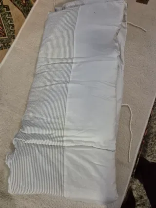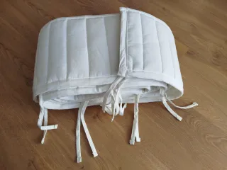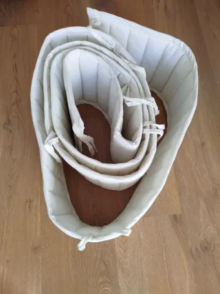 Protector acolchado para cuna de bebé, también conocido como chichonera. Es de color blanco y cuenta con cintas para su sujeción. - Medidas 60 x 120 cm. - Material textil acolchado. - Diseño con costuras verticales. - Incluye cintas de atar. Regalo toallas, un toalla con campucha de Disney tipo poncho y la otra toalla con capucha.