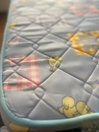 Colchón para cuna con un diseño infantil. - Acolchado con relleno. - Estampado de patitos y cuadros. - Ribete azul. Medidas: 115x58x14cm