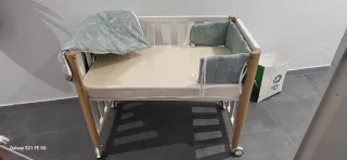 Mini cuna de colecho con un diseño moderno y funcional. Perfecta para tener al bebé cerca durante la noche. - Estructura de madera y blanco. - Incluye colchón. - Ruedas para facilitar el movimiento. - Regulable en altura el colchón.