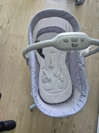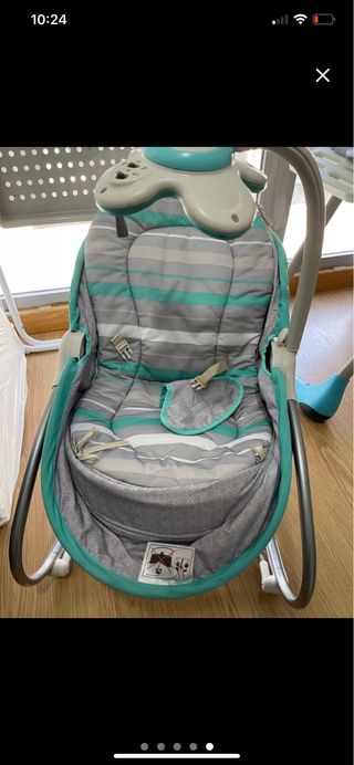 Hamaca para bebé con un diseño moderno y cómodo. También vale como cuna, moisés o cuco para breves siestas,manteniendo el cabecero elevado. Marca tiny love. - Colores grises, blancos y turquesas. - Acolchado suave. - Cinturón de seguridad. - tiene luces y sonidos que despierta la atención del bebé. también tiene colgado dos sonajeros. en su caja y su libro de instrucciones, se entrega desmontada