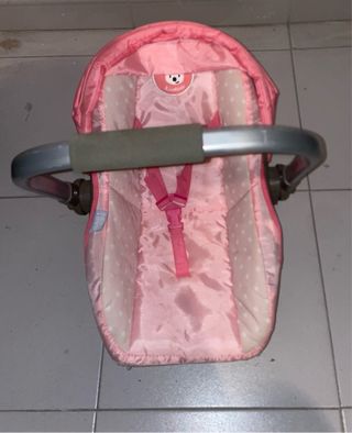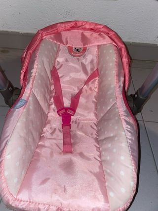 Cuna de juguete para bebés, ideal para juegos. - Color rosa con detalles de lunares blancos. - Incluye cinturón de seguridad rosa. - Asa plateada con agarre gris.