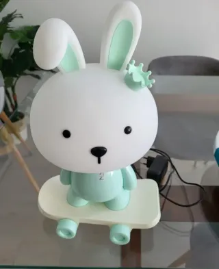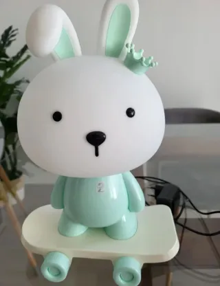 Adorable lámpara con forma de conejito montado en un patinete. Perfecta para dar un toque divertido a cualquier habitación. - Diseño de conejito blanco y verde menta. - Base con forma de patinete. - Orejas de conejito. - Corona decorativa en la cabeza.