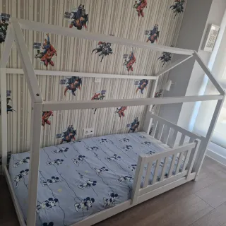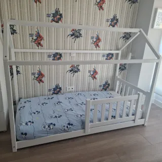 Cama estilo Montessori para habitación infantil, con medidas de 90x190 cm. - Estructura de madera blanca. - Diseño de casa con tejado. - Barreras de seguridad incluidas.