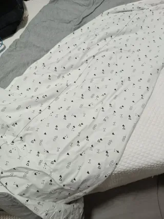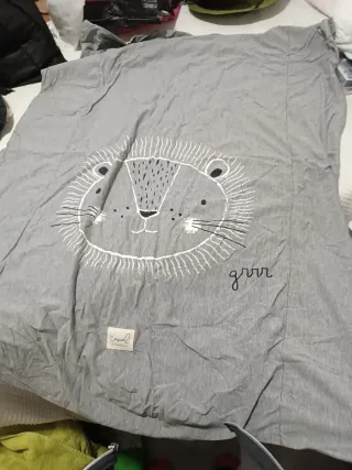 Conjunto de ropa de cama, para cuna de 120 x 60. Incluye 2 protectores transpirables e impermeables ajustables, 3 sábanas bajeras ajustables (blanca con estampado geométrico en verde, otra blanca totalmente y otra con estrellitas grises), 2 colchas suaves reversibles (con 1 relleno),una con diseño de león por un lado y detalles geométricos en el otro, y con fundita de almohada a juego y otra con animalitos (con chichonera a juego). Otra colcha con rellenito nórdico y almohada en salmón. Las 3 reversibles. Incluye también mantita arrullo suave hecha a mano, con cambiador a juego (blanco de un lado y gris con gotas blancas del otro).