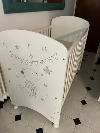 Cuna de bebé en color blanco con un adorable diseño de conejo grabado en el lateral. Ideal para la habitación infantil. - Diseño de conejo y círculos. - Acabado blanco. - Estructura de madera. - incluye colchón ecus kids viscolastico y transpirable y antiacaros, nordico y protector. Precio nuevo 350 euros.